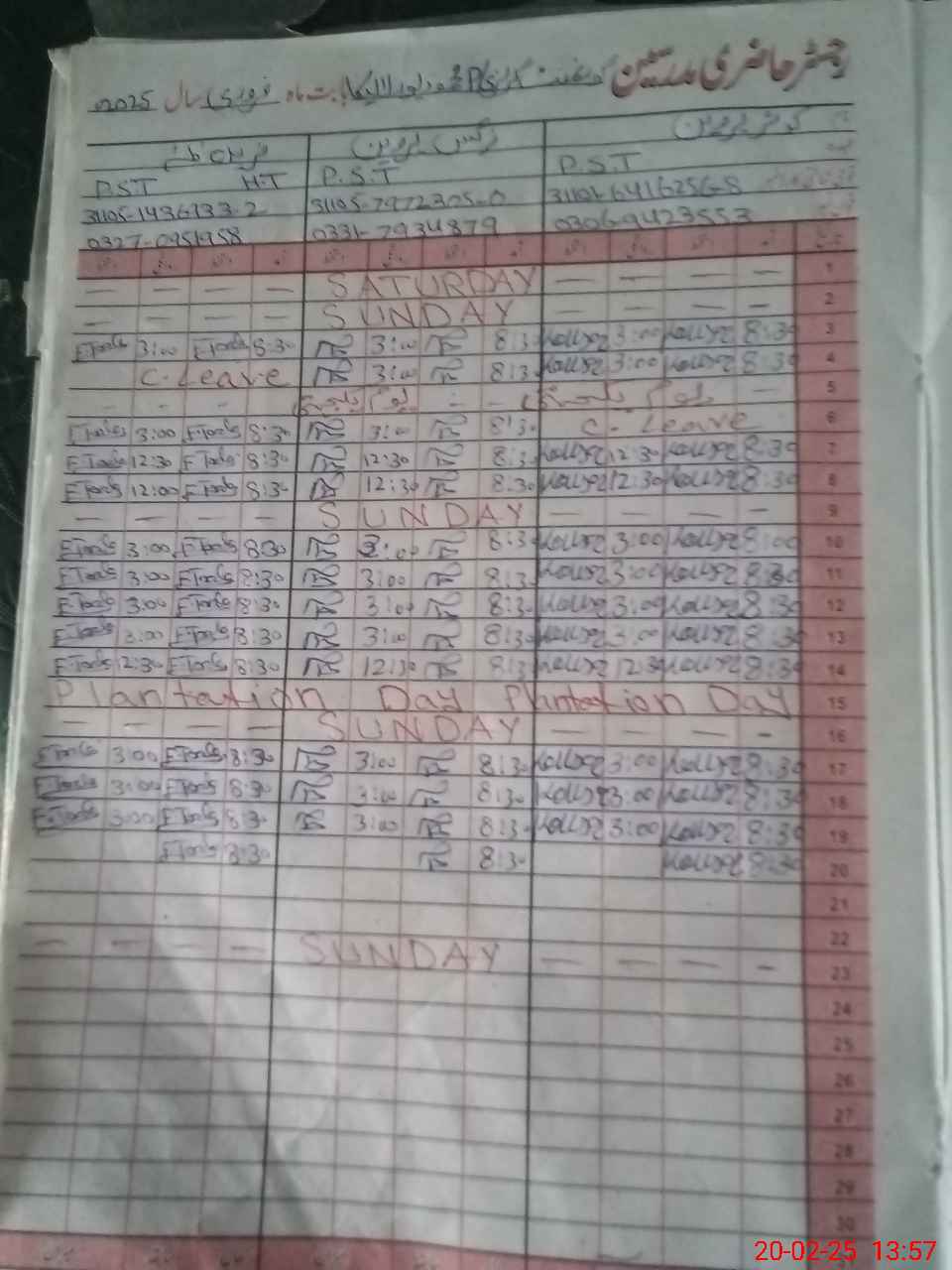 | CNIC | Full Name | Designation | R/C | Absence During Last Calender Month |