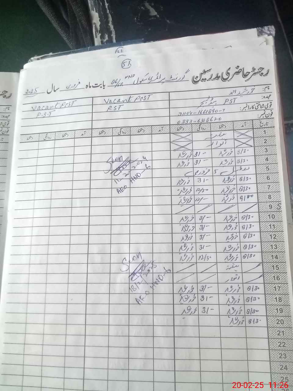 | Name: Kh**** Ah**** Designation: (School Headmaster's/Headmistress's) PST Phone/Cell Number: 03**** |