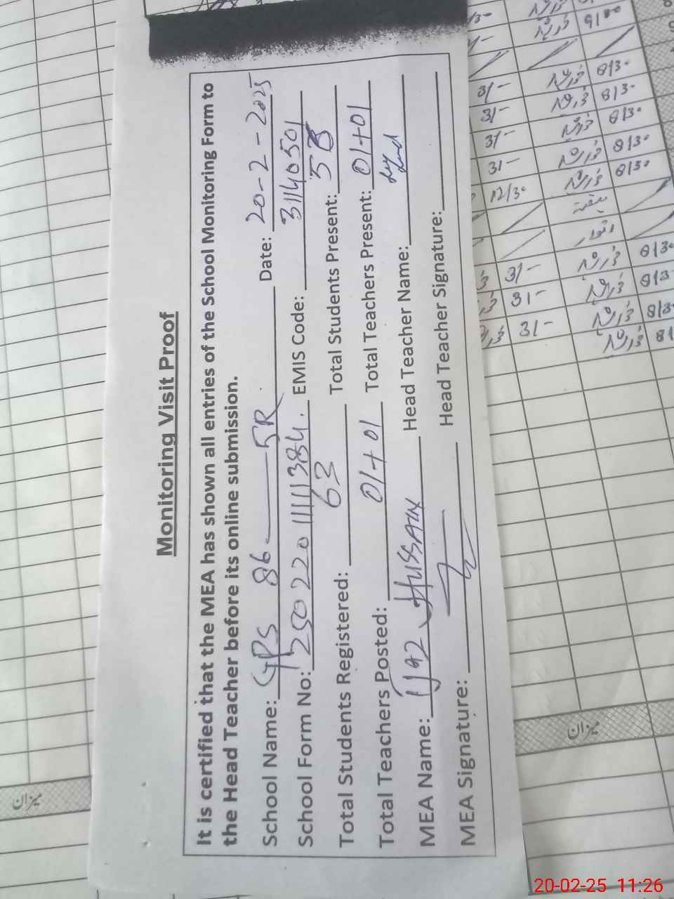 | Attendance Register | Head Teacher | MEA with School | Visit Proof |