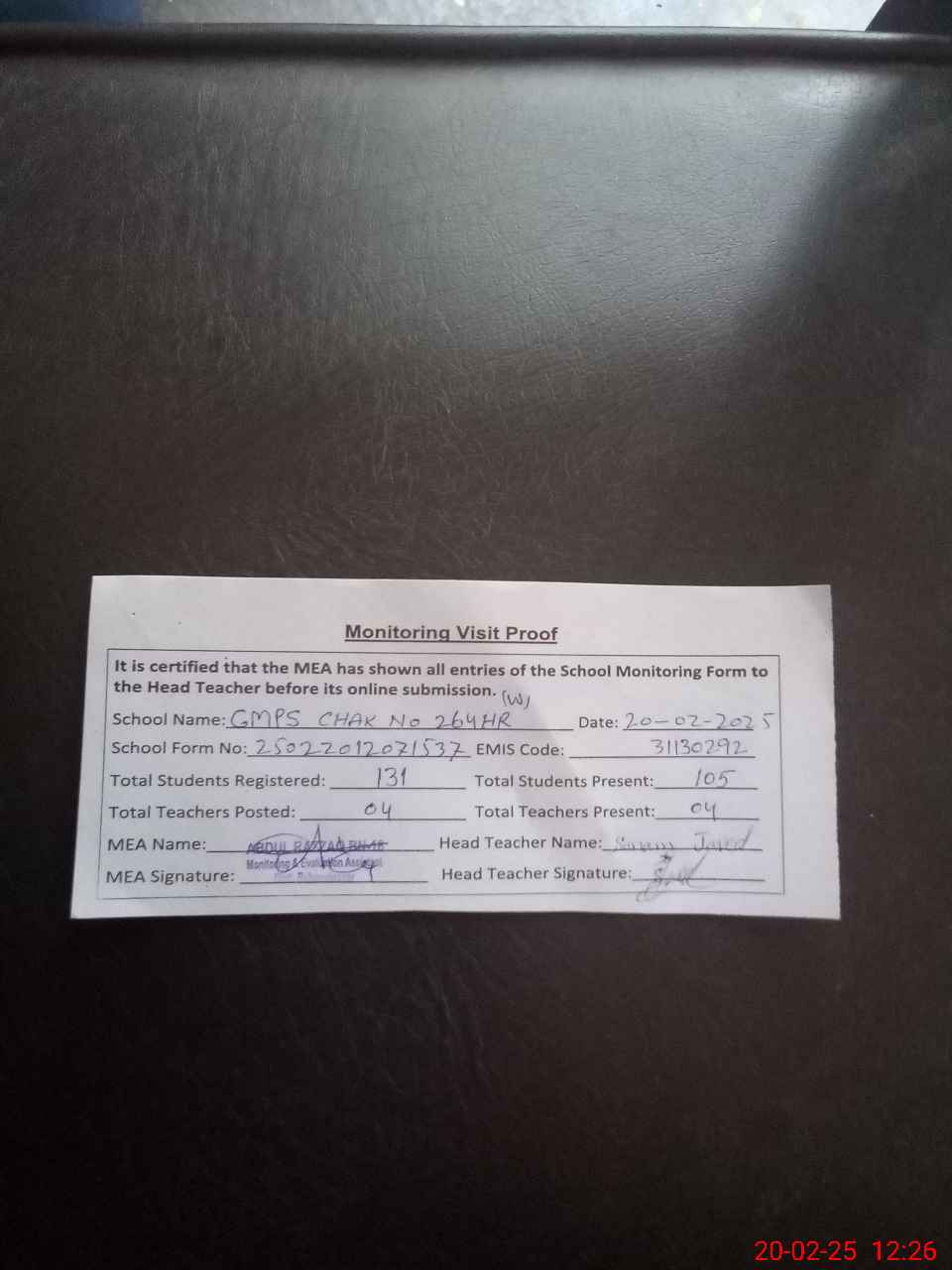 | EMIS Code: 31130292 | Name of School: GMPS CHAK NO. 264 HR W | |||