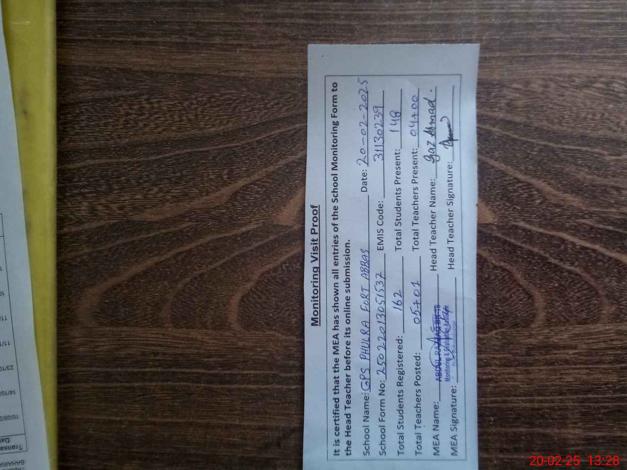 | EMIS Code: 31130239 | Name of School: GPS PHULRA FORT ABBAS | |||