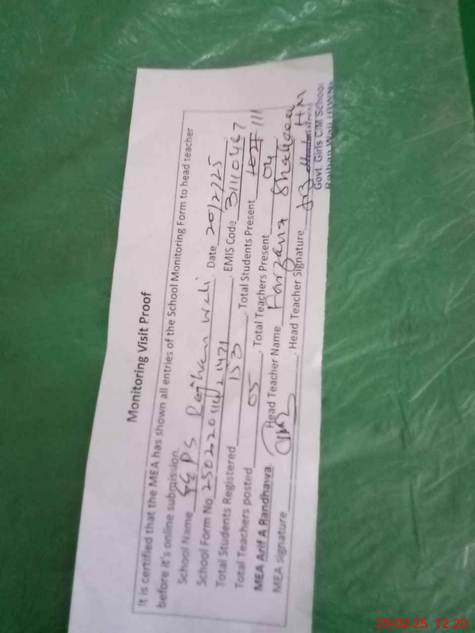 | Remarks (Use Separate Page if Required): M Fizz Bulavi attached to Deputy DEO office M Zahid and Sajid CIV suspended and not present in the school FTF not collecting One Toilet blocked Toilets are dirty | |||||