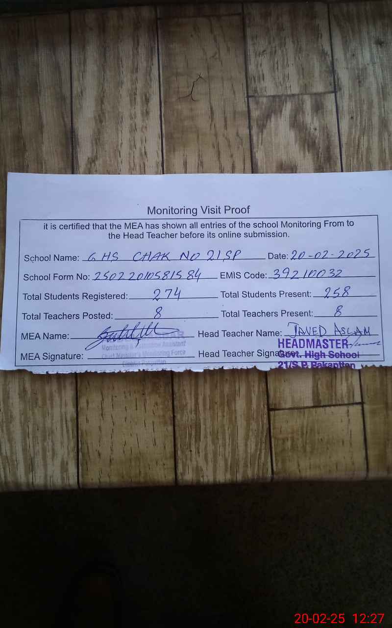 | EMIS Code: 39210032 | Name of School: GHS CHAK NO. 21/SP | |||