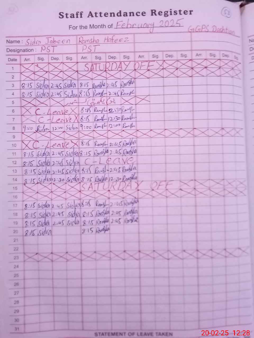 | Leave | Duty | Absent | Maternity | Medical | Ex- Pak |