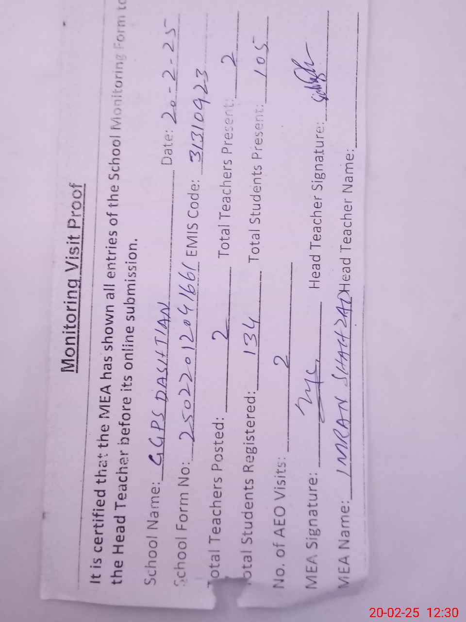 | Attendance Register | Head Teacher | MEA with School | Visit Proof |