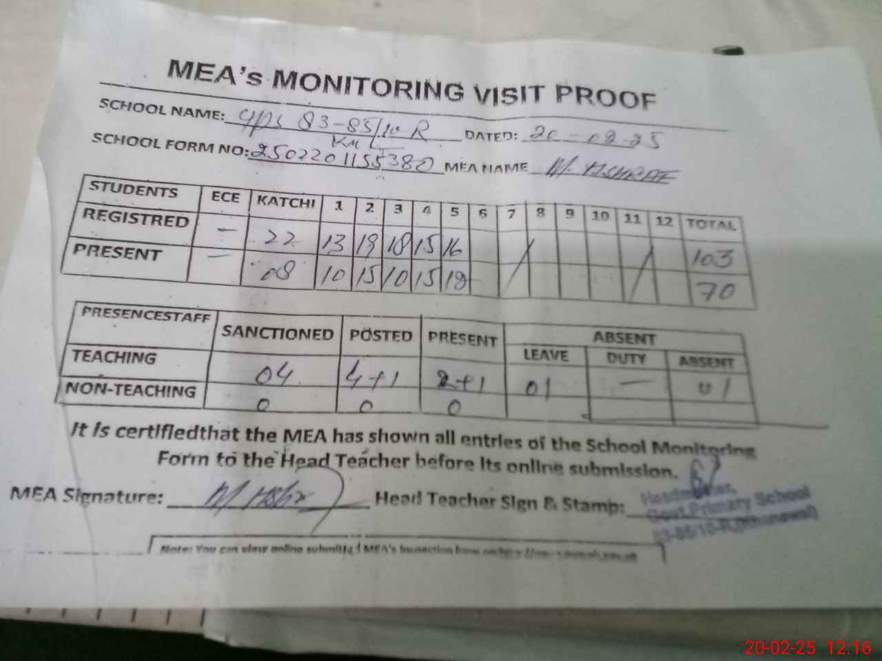 | Attendance Register | Head Teacher | MEA with School | Visit Proof |