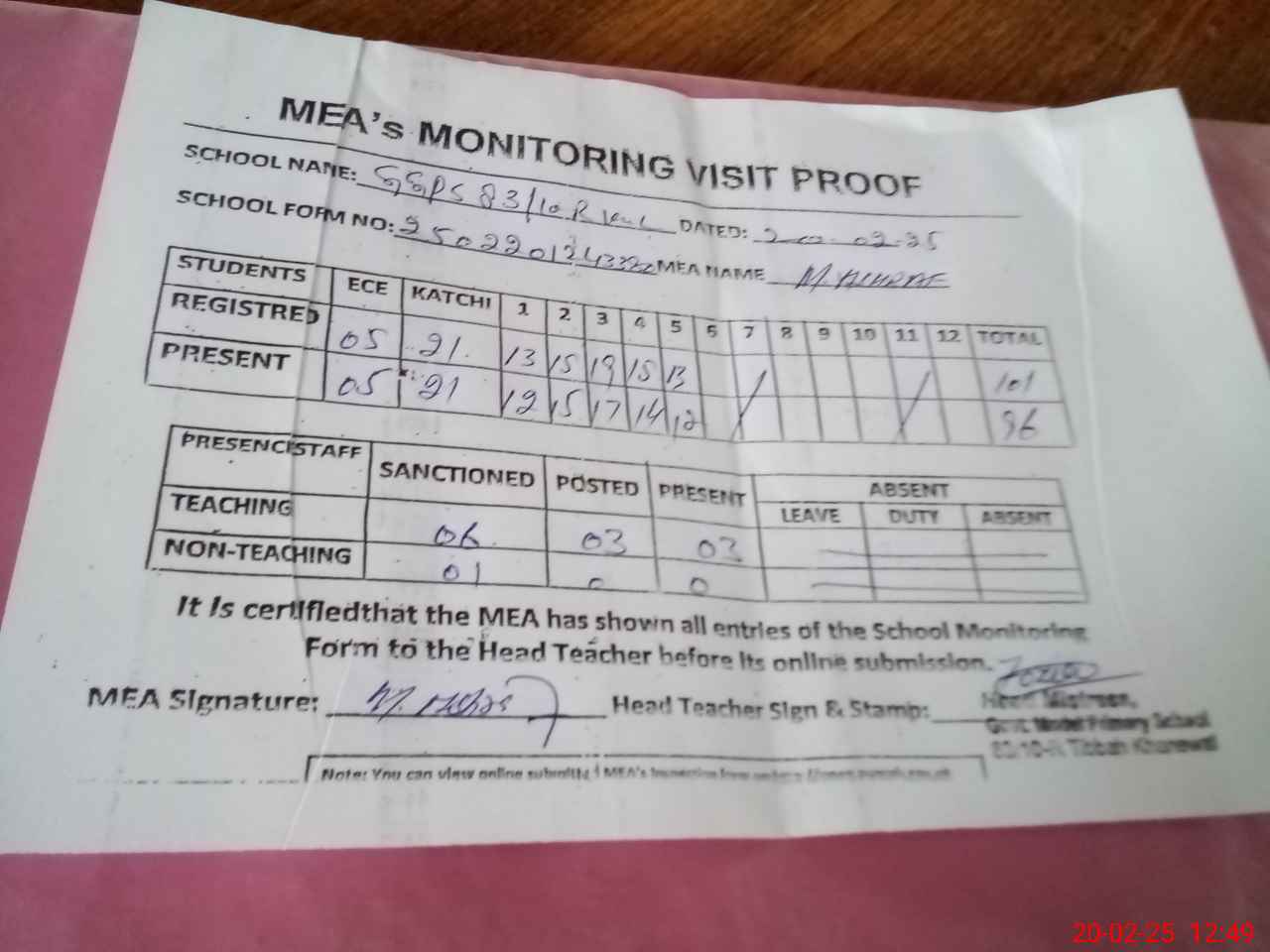 | Attendance Register | Head Teacher | MEA with School | Visit Proof |