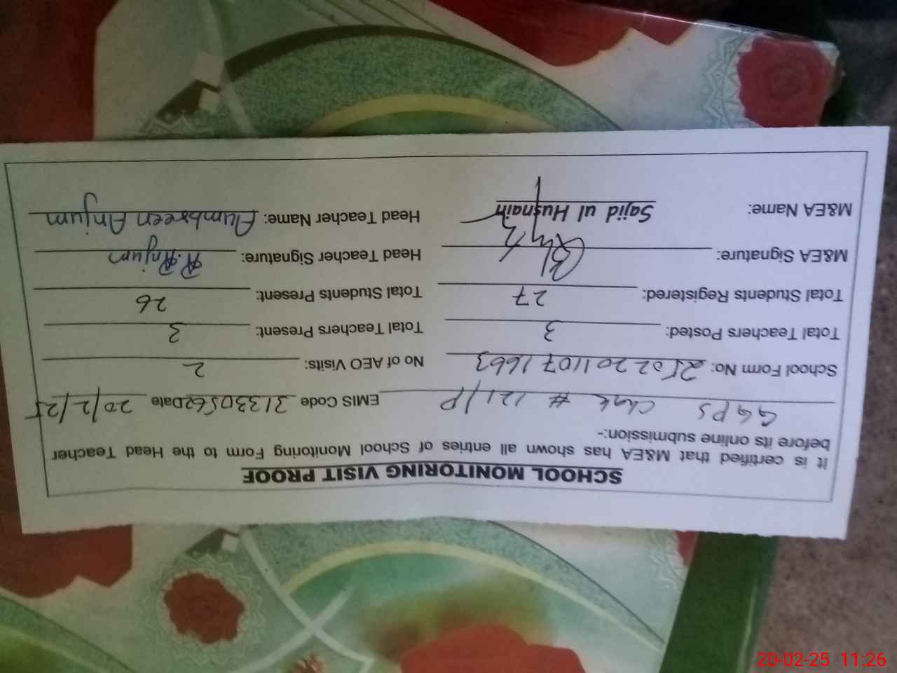 | Attendance Register | Head Teacher | MEA with School | Visit Proof |