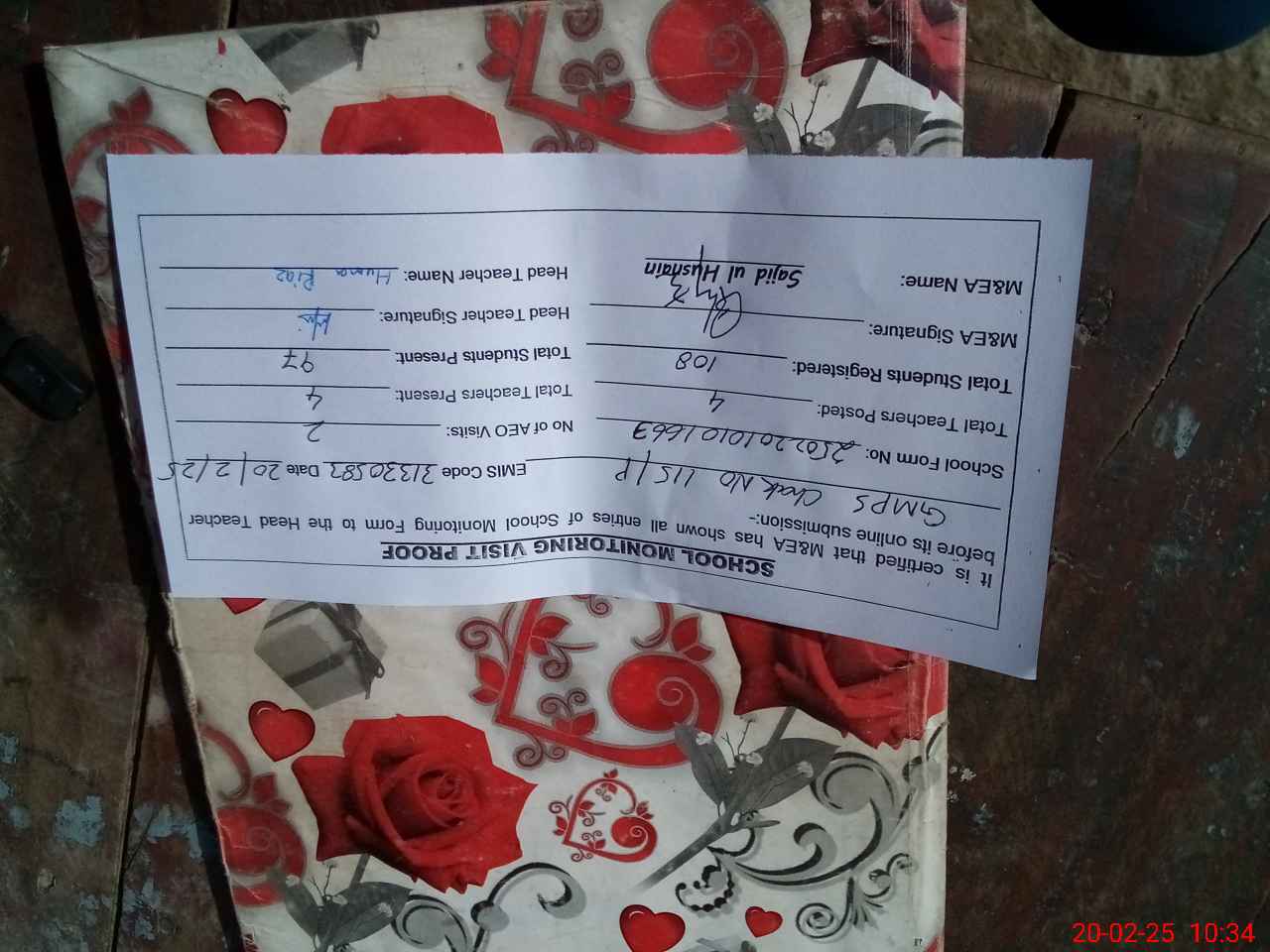 | Attendance Register | Head Teacher | MEA with School | Visit Proof |