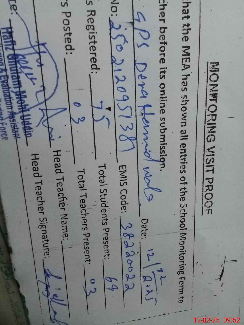| EMIS Code: 38220022 | Name of School: GPS DERA HAMID WALA | |||