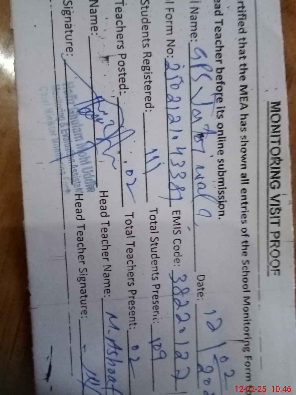 | EMIS Code: 38220127 | Name of School: GPS JATOI WALA | |||