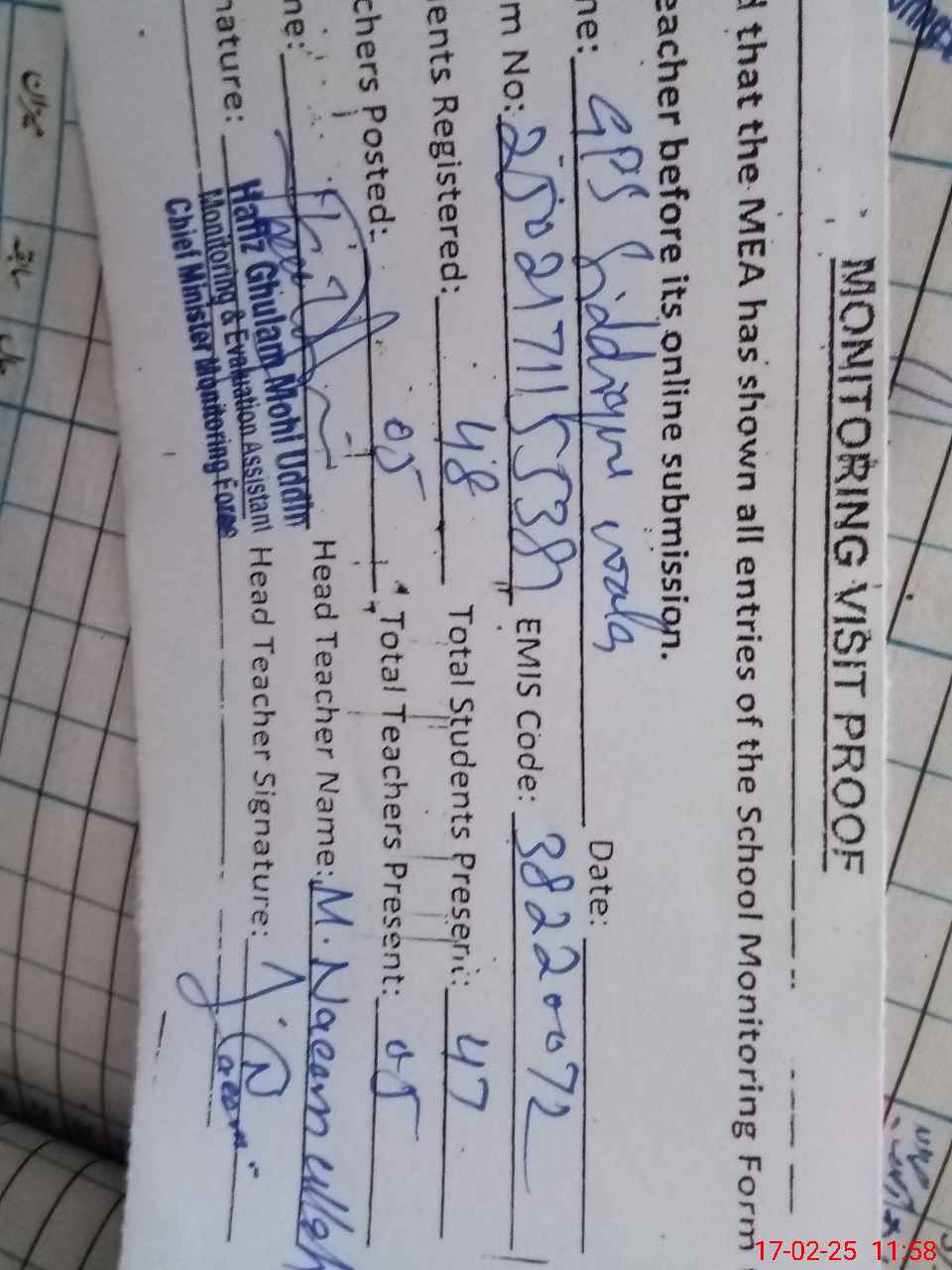 | EMIS Code: 38220072 | Name of School: GPS SIDDIQUE WALA | |||