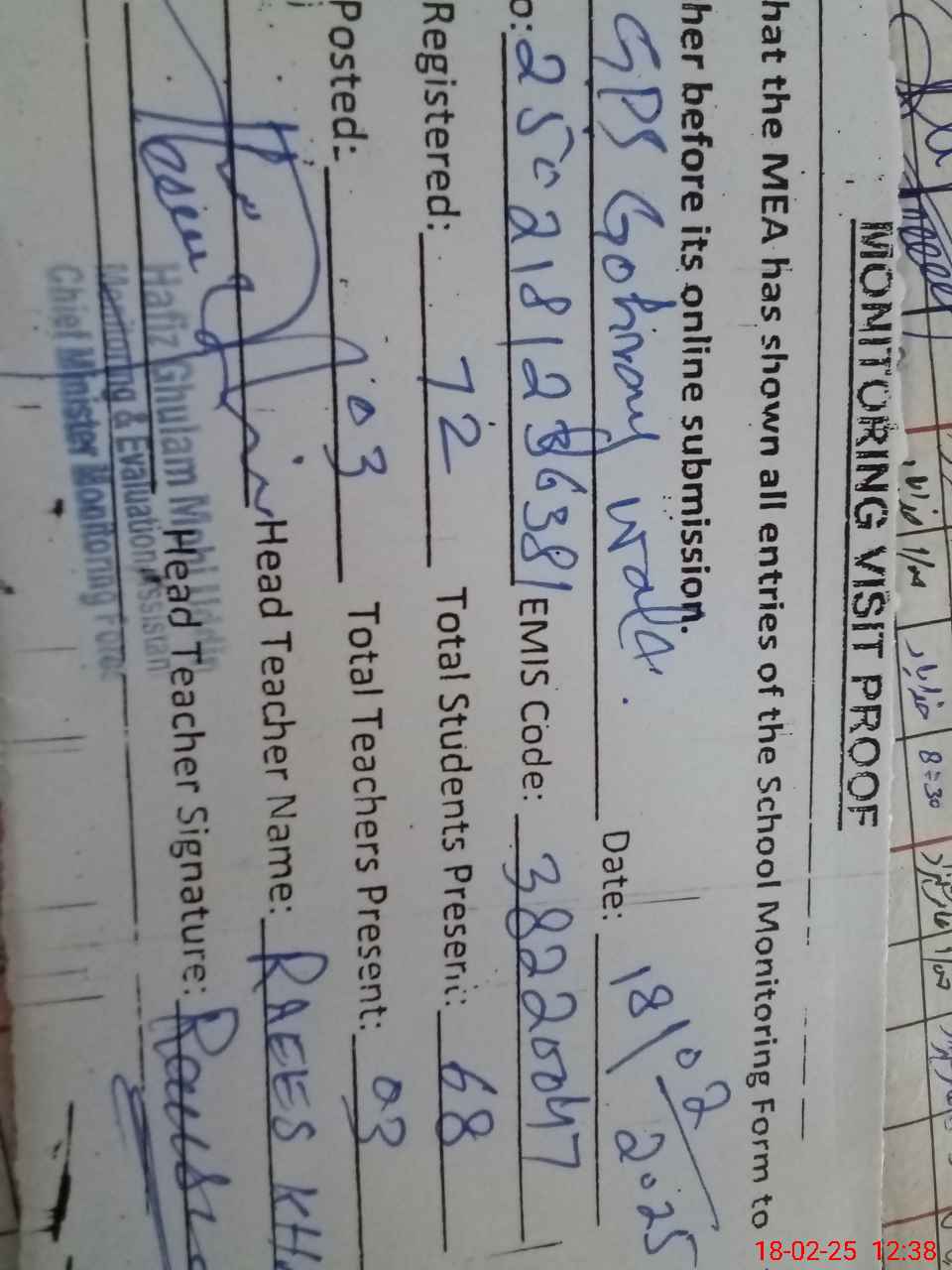 | EMIS Code: 38220047 | Name of School: GPS GOHRAY WALA | |||