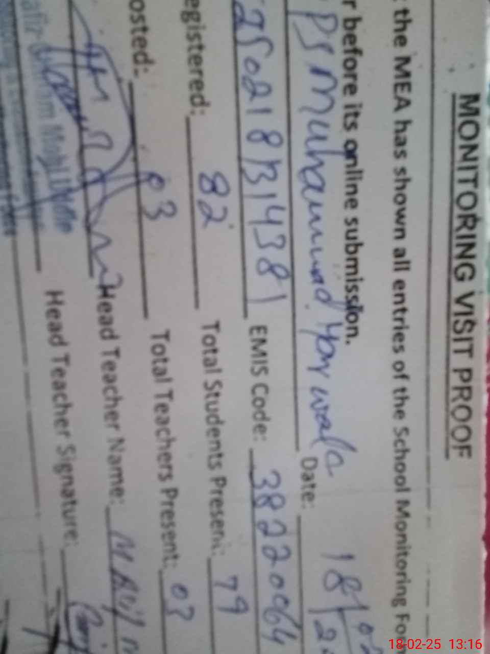 | Attendance Register | Head Teacher | MEA with School | Visit Proof |