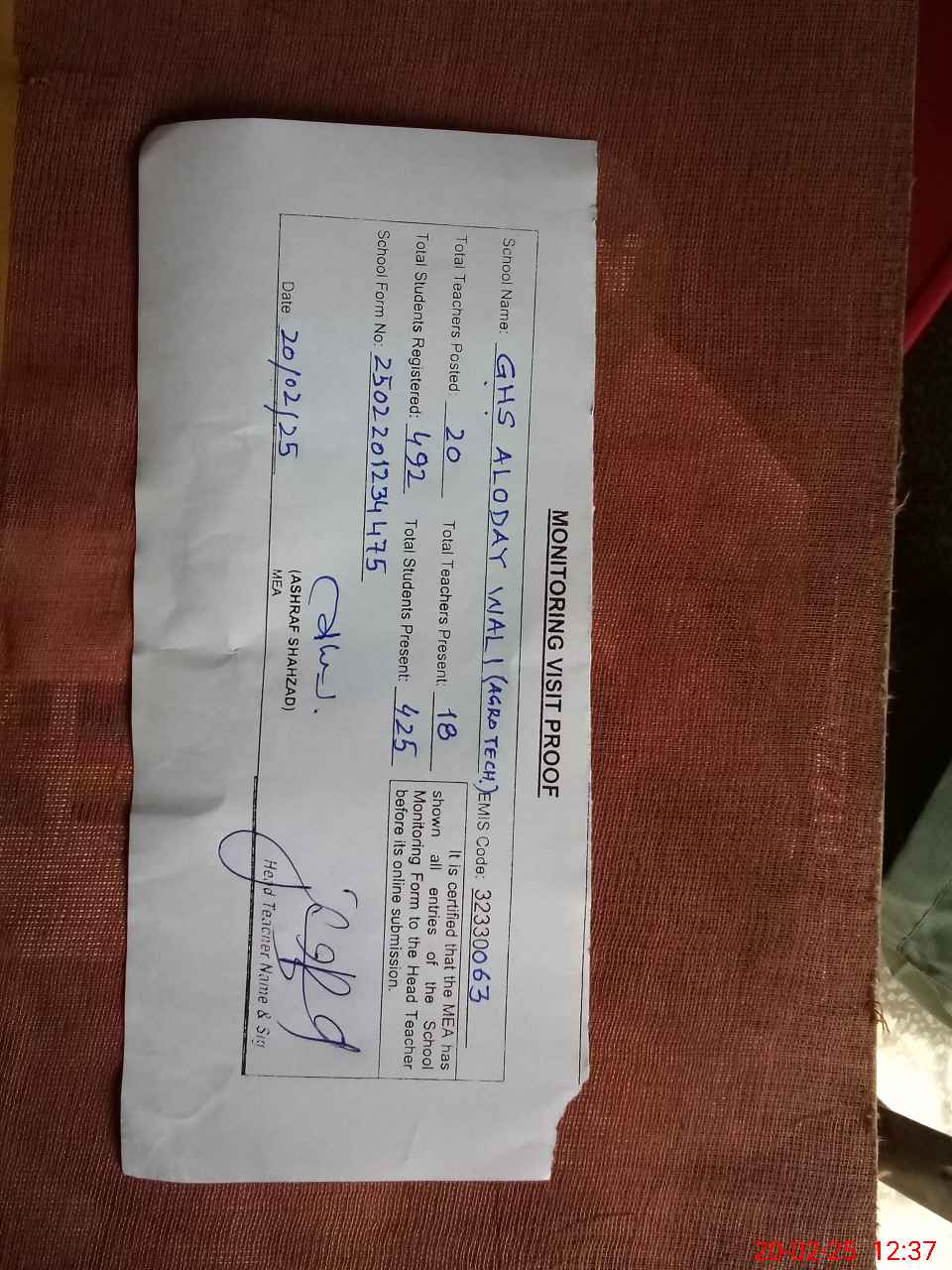 | Attendance Register | Head Teacher | MEA with School | Visit Proof |