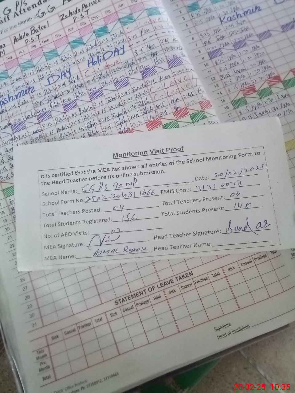 | Attendance Register | Head Teacher | MEA with School | Visit Proof |