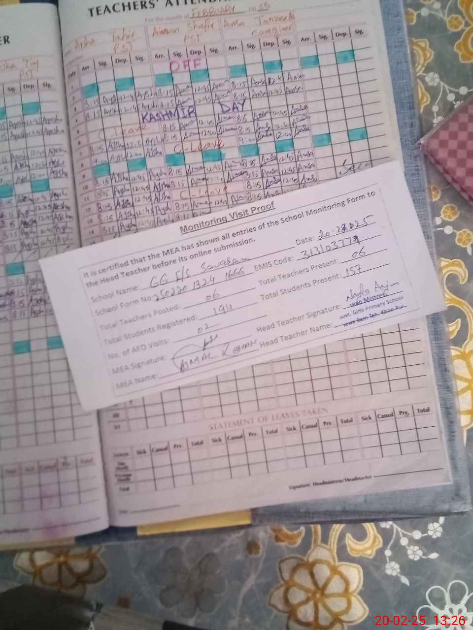 | Attendance Register | Head Teacher | MEA with School | Visit Proof |