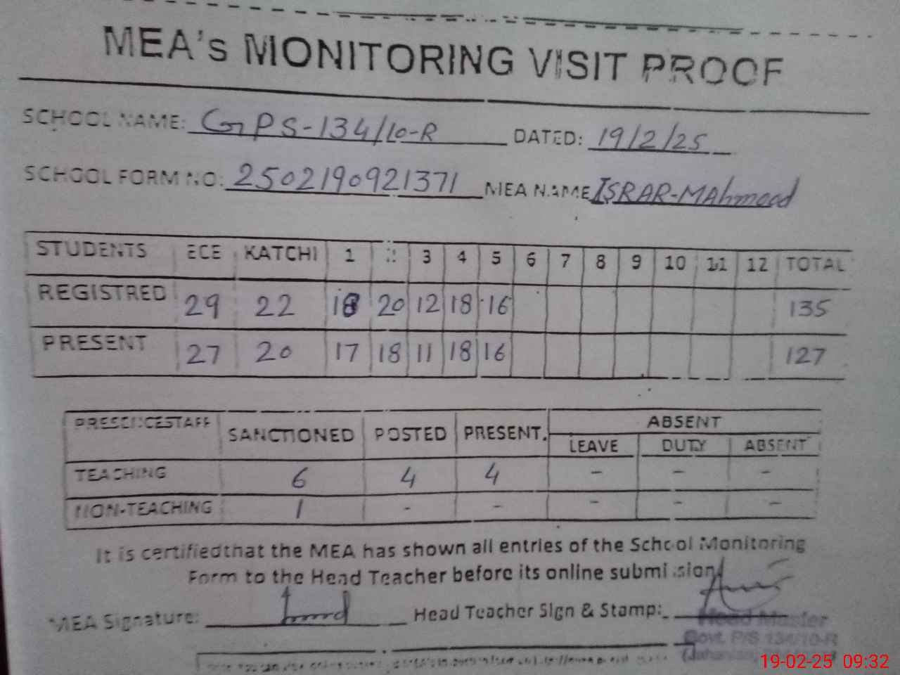 | Attendance Register | Head Teacher | MEA with School | Visit Proof |