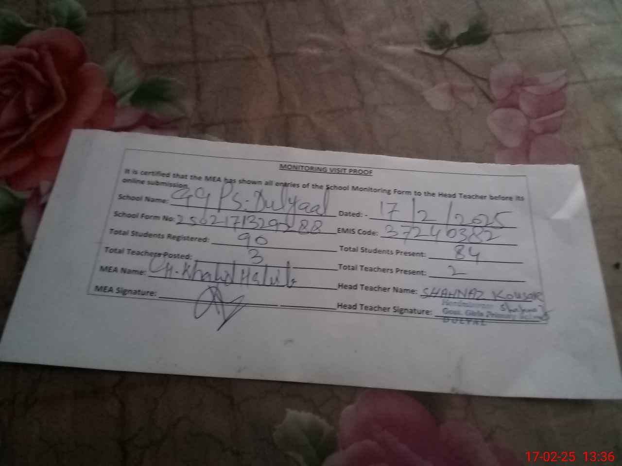 | Attendance Register | Head Teacher | MEA with School | Visit Proof |