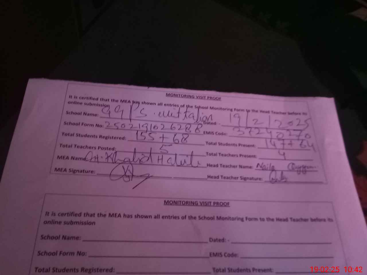 | Attendance Register | Head Teacher | MEA with School | Visit Proof |