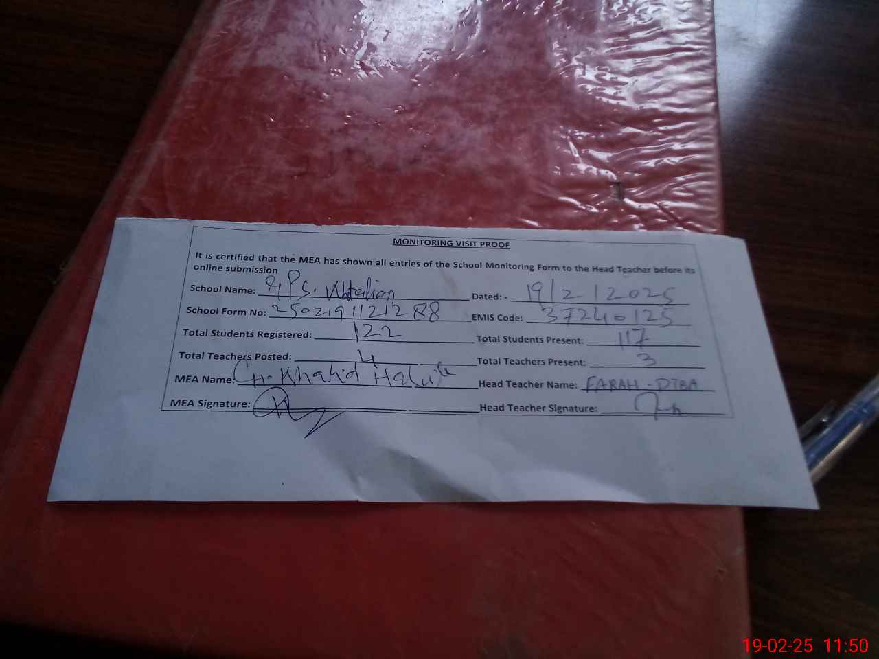 | Attendance Register | Head Teacher | MEA with School | Visit Proof |