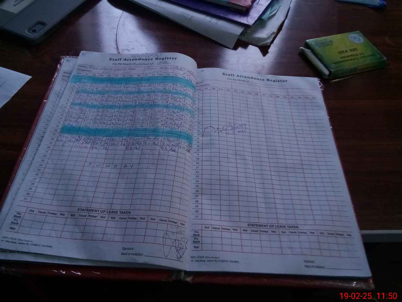 | CNIC | Full Name | Designation | R/C | Absence During Last Calender Month |
