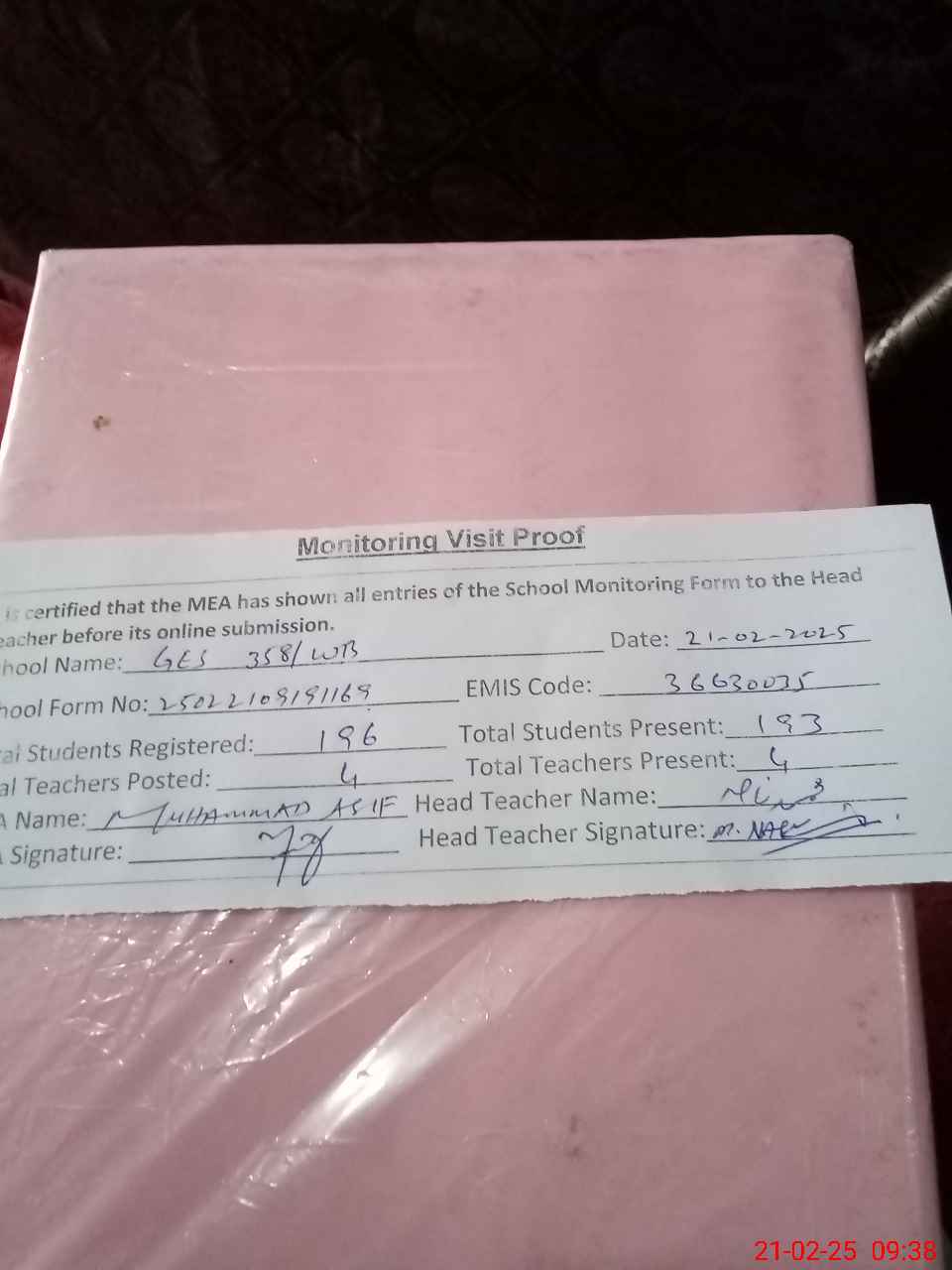 | Attendance Register | Head Teacher | MEA with School | Visit Proof |