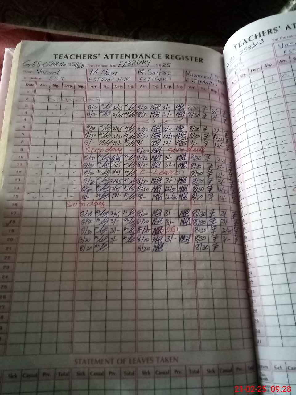 | Leave | Duty | Absent | Maternity | Medical | Ex- Pak |