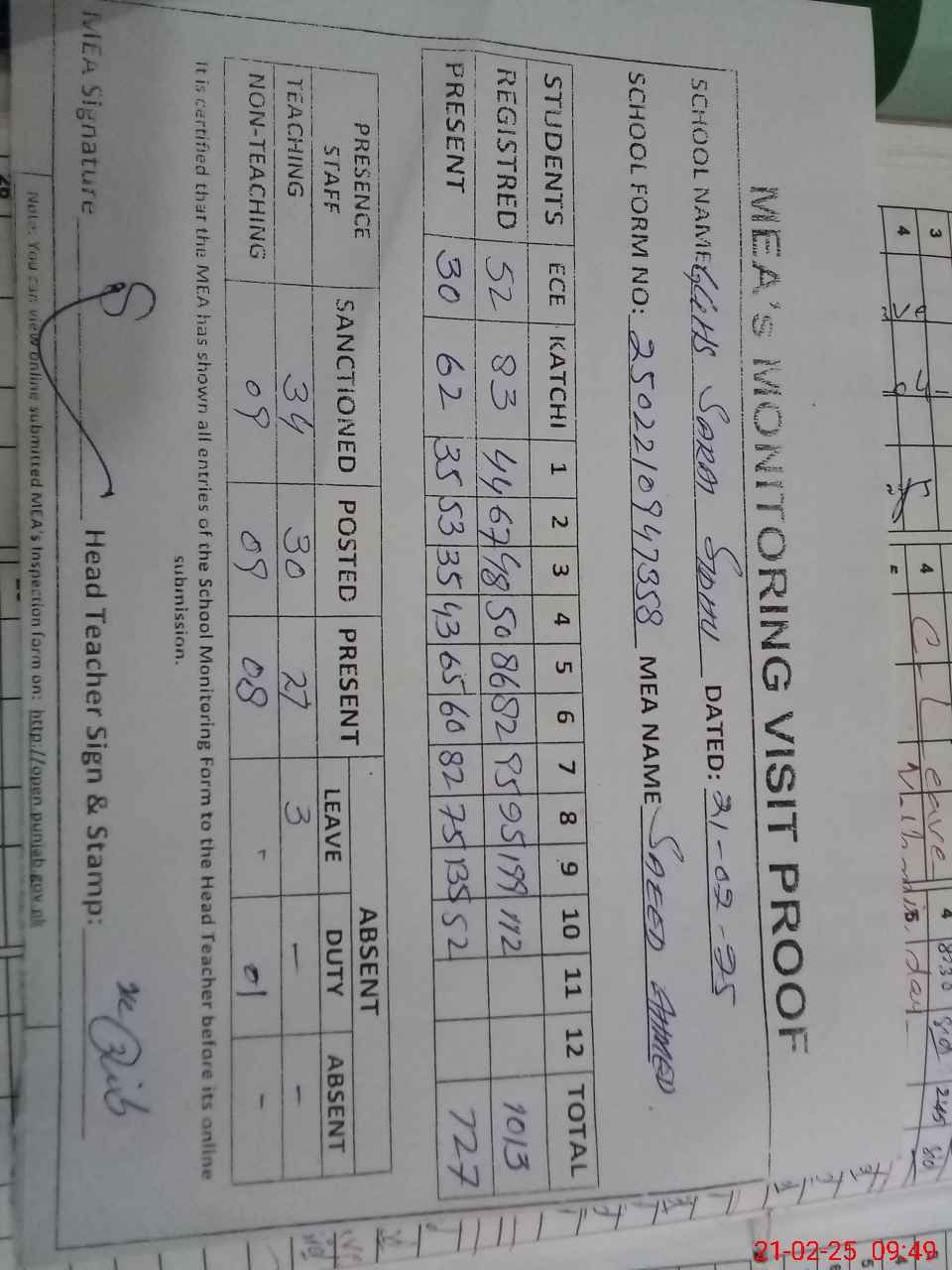 | Attendance Register | Head Teacher | MEA with School | Visit Proof |