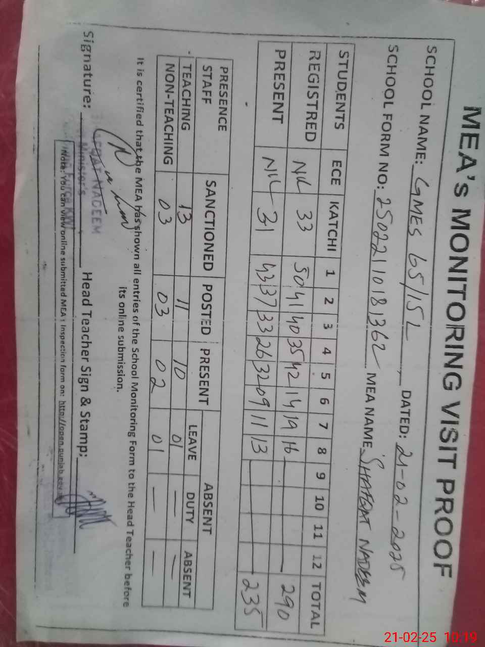 | Certified that this School was Inspected by the Undersigned MEA/DMO Today and the Information Stated Above is as Per Record. | |||||