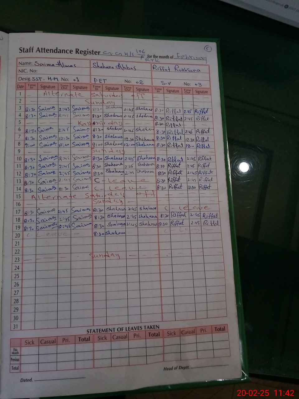 | CNIC | Full Name | Designation | R/C | Absence During Last Calender Month |