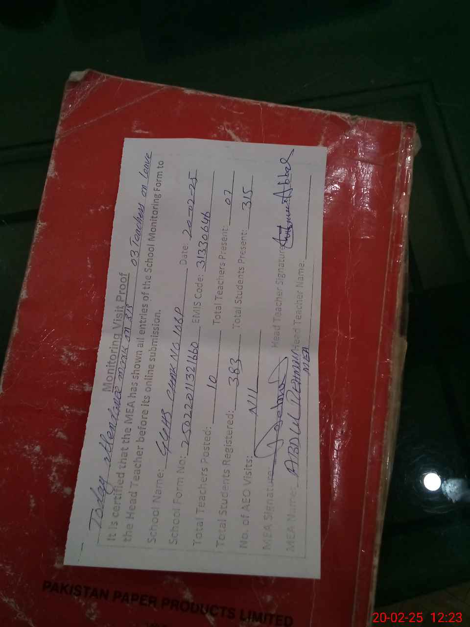 | Attendance Register | Head Teacher | MEA with School | Visit Proof |