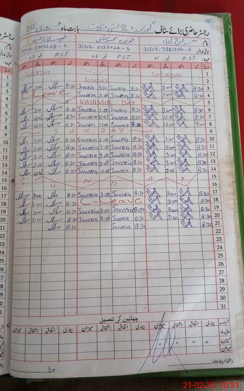 | CNIC | Full Name | Designation | R/C | Absence During Last Calender Month |
