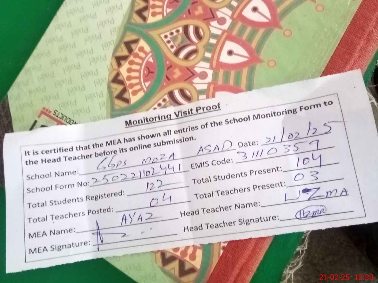 | Attendance Register | Head Teacher | MEA with School | Visit Proof |