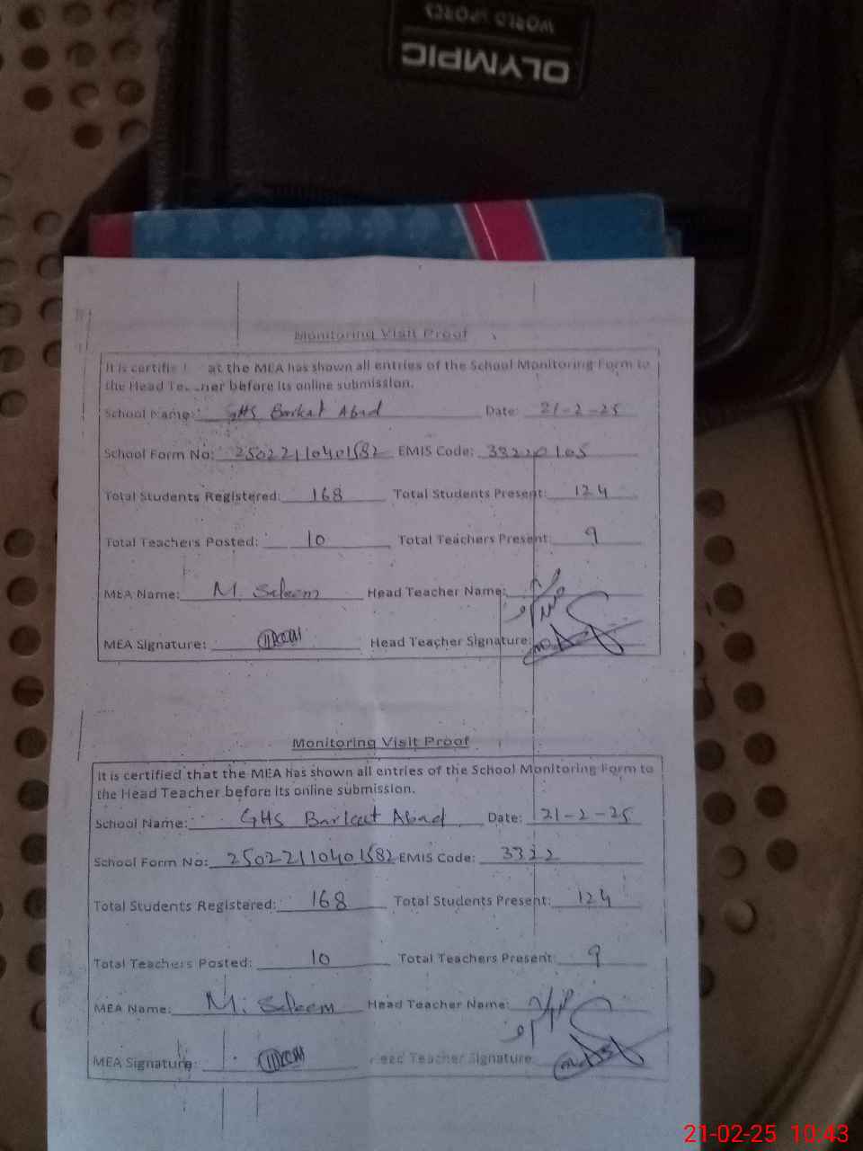 | EMIS Code: 33220105 | Name of School: GHS BARKAT ABAD | |||