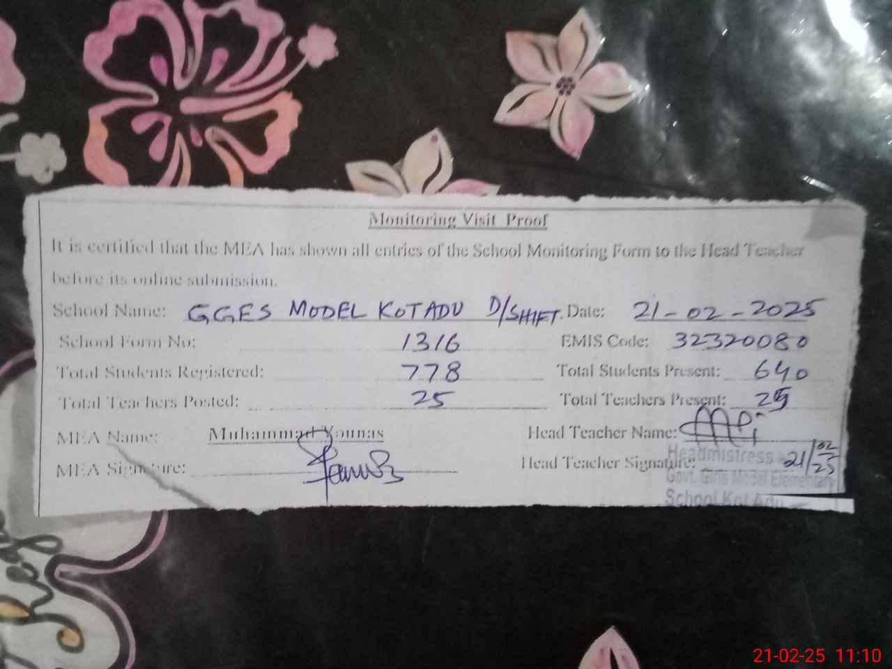 | Certified that this School was Inspected by the Undersigned MEA/DMO Today and the Information Stated Above is as Per Record. | |||||