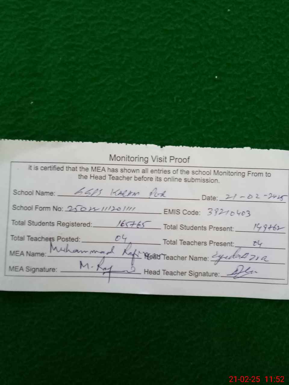 | Attendance Register | Head Teacher | MEA with School | Visit Proof |