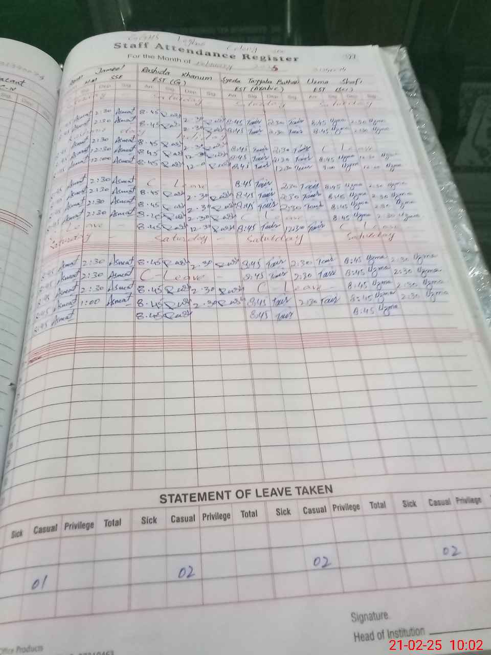 | Leave | Duty | Absent | Maternity | Medical | Ex- Pak |
