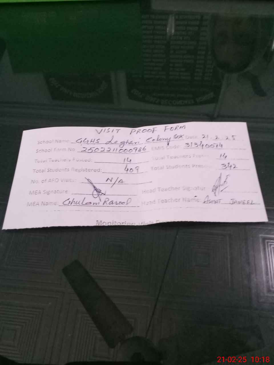 | Attendance Register | Head Teacher | MEA with School | Visit Proof |