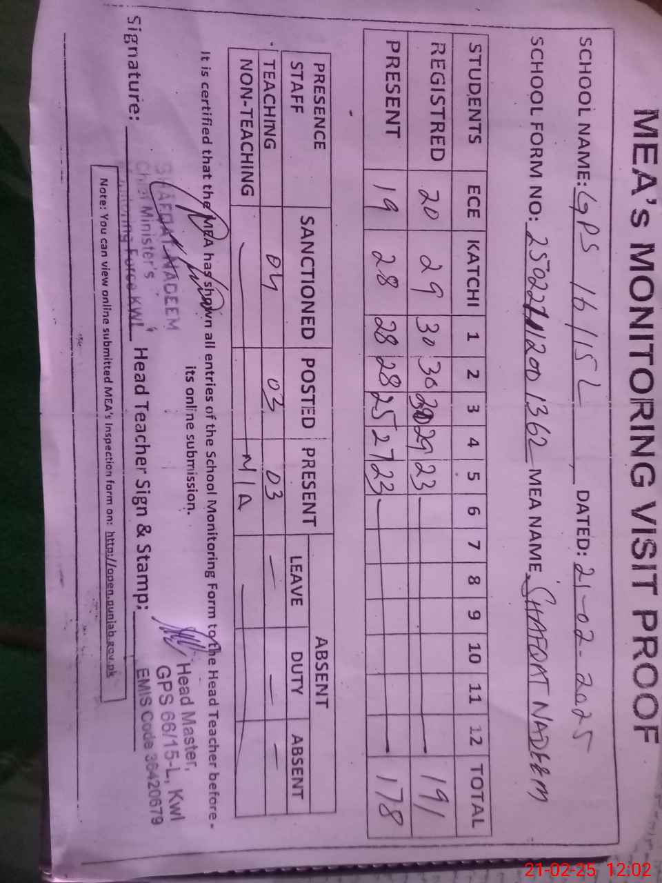 | Attendance Register | Head Teacher | MEA with School | Visit Proof |
