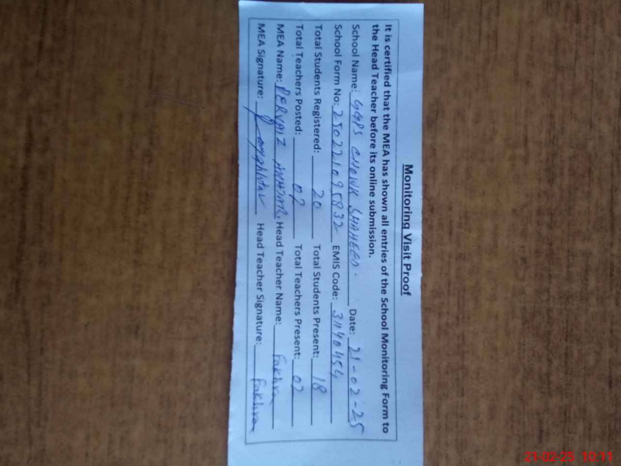 | Attendance Register | Head Teacher | MEA with School | Visit Proof |