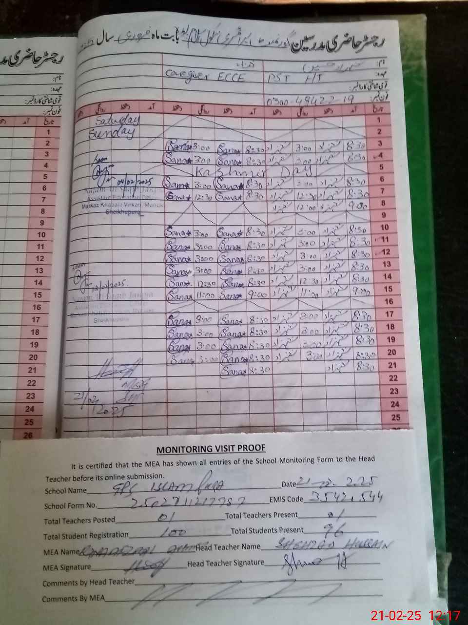 | Attendance Register | Head Teacher | MEA with School | Visit Proof |