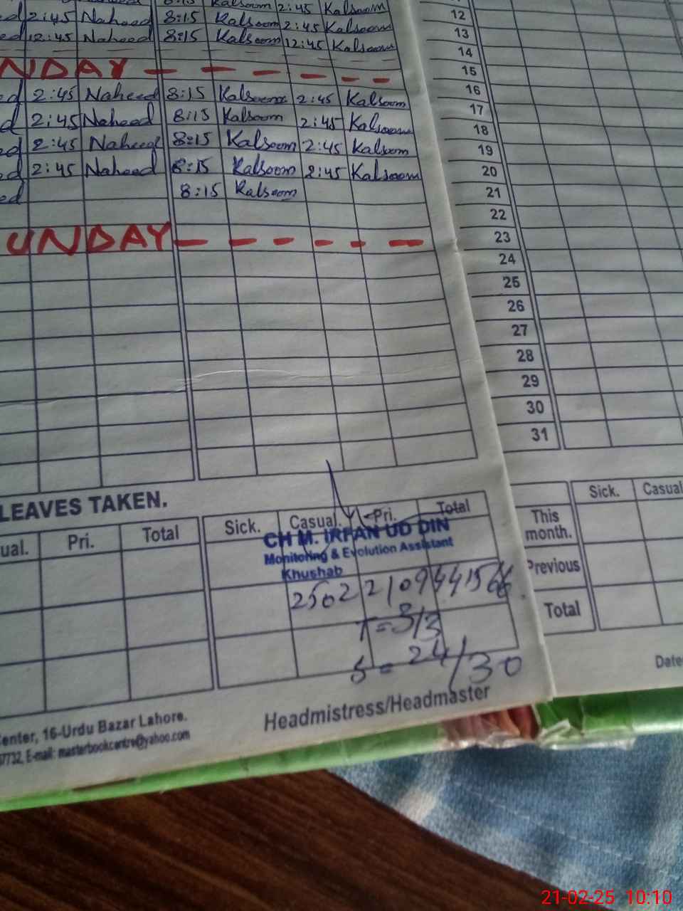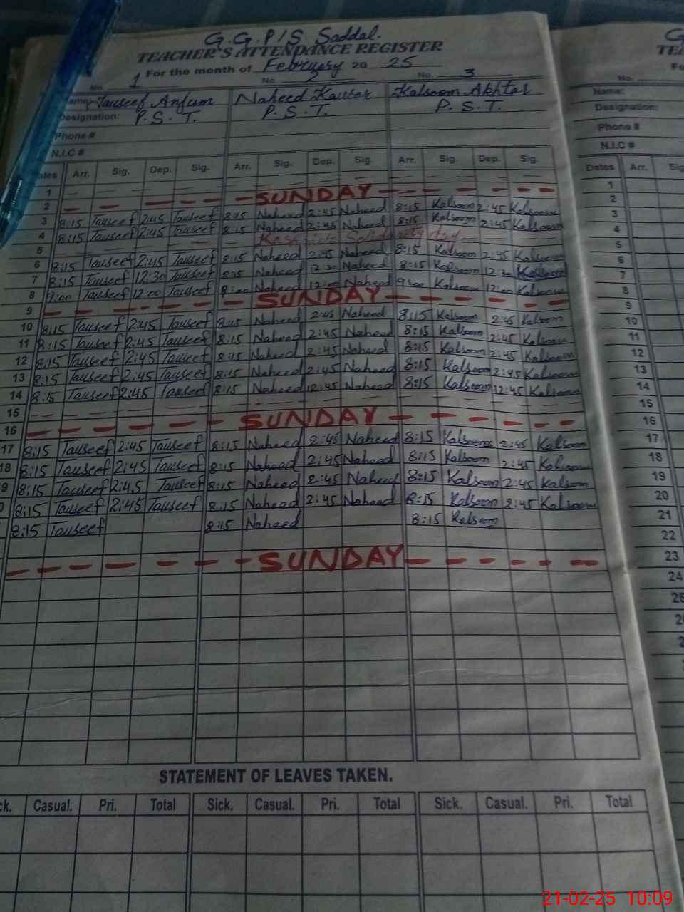 | CNIC | Full Name | Designation | R/C | Absence During Last Calender Month |