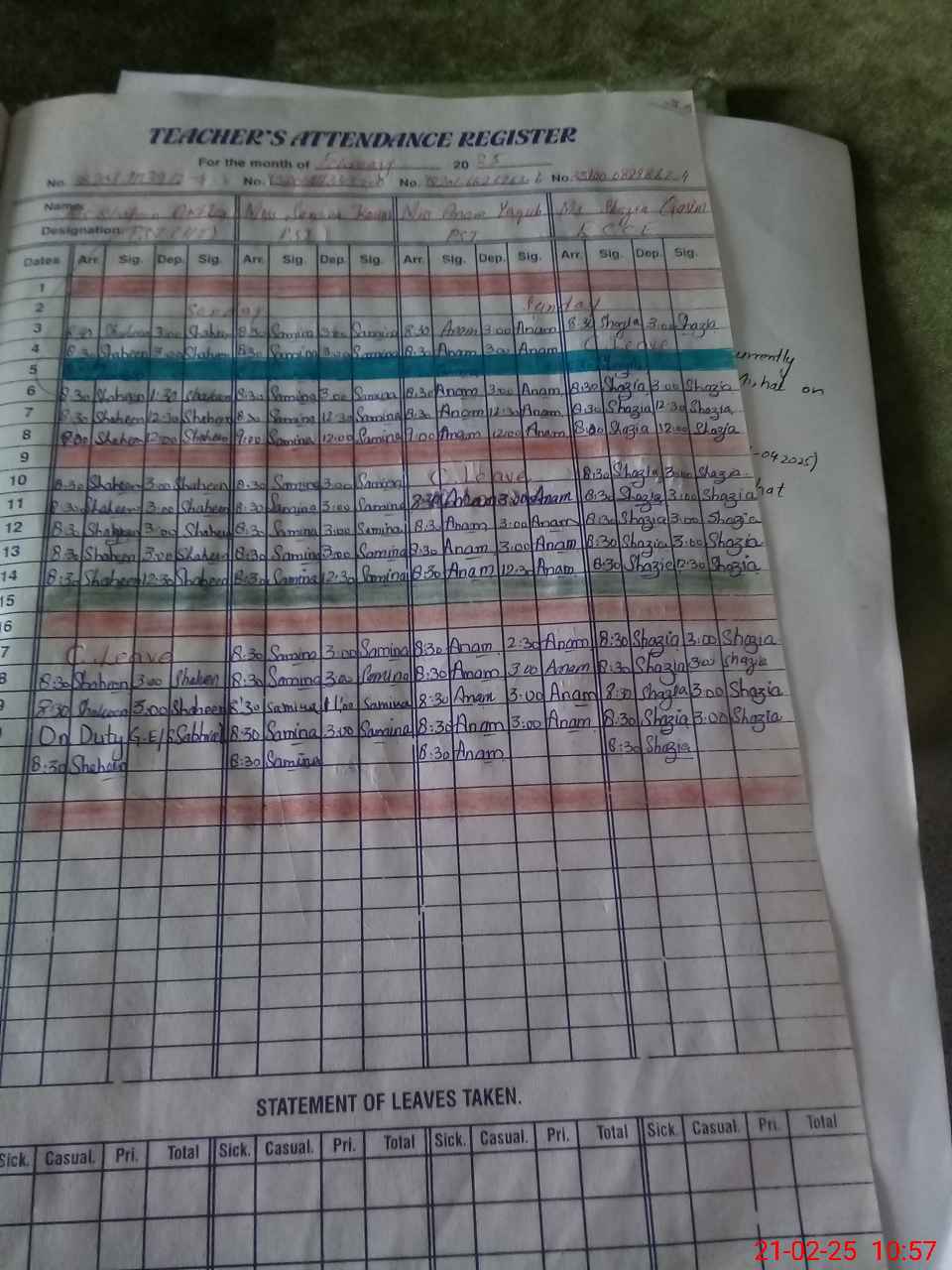| Leave | Duty | Absent | Maternity | Medical | Ex- Pak |