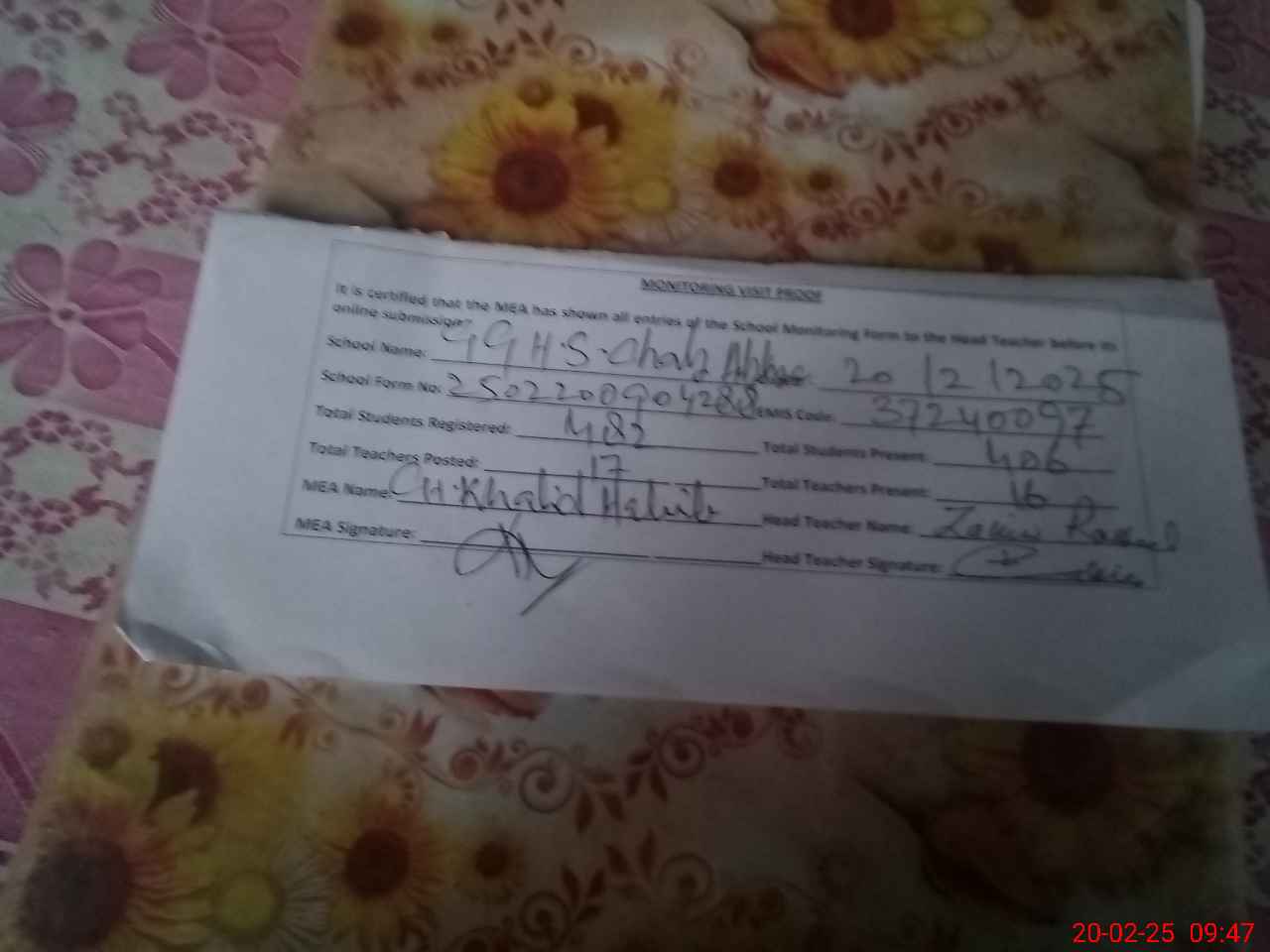 | Attendance Register | Head Teacher | MEA with School | Visit Proof |