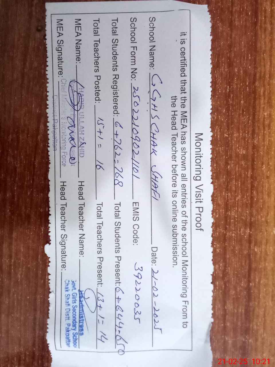 | EMIS Code: 39220035 | Name of School: GGHS CHAK SHAFI | |||