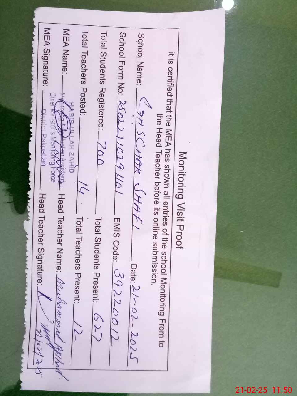| Attendance Register | Head Teacher | MEA with School | Visit Proof |