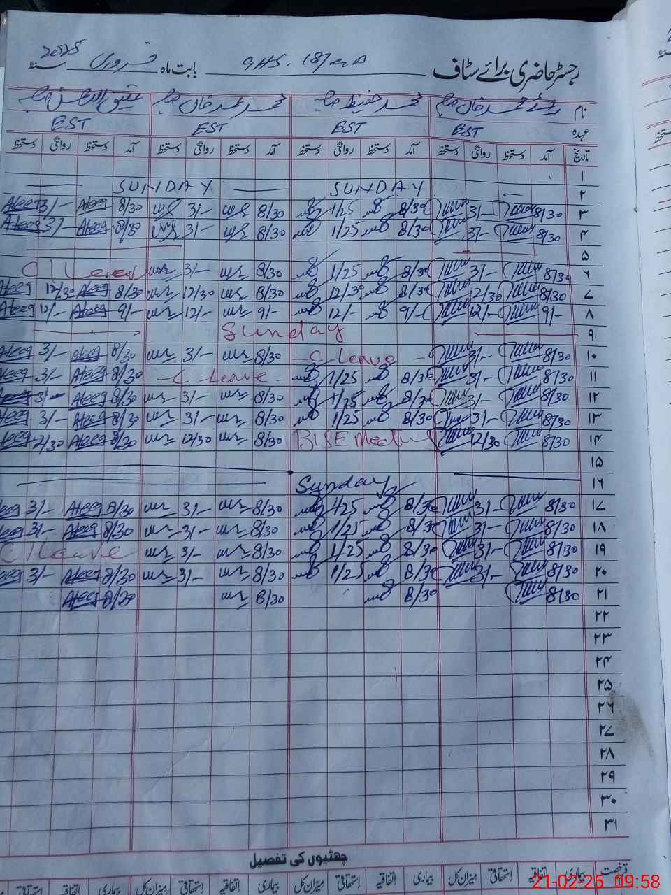 | 35**** | Na**** Ma**** | KHAKROOB | 0 | 0 | 31 | 0 | 0 | 0 | 0 | 0 | 0 | Absent (Un-Authorized) | |