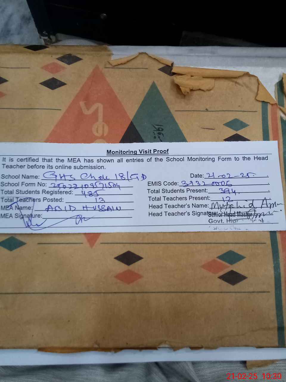 | EMIS Code: 39320006 | Name of School: GHS CHAK NO. 18/G.D | |||