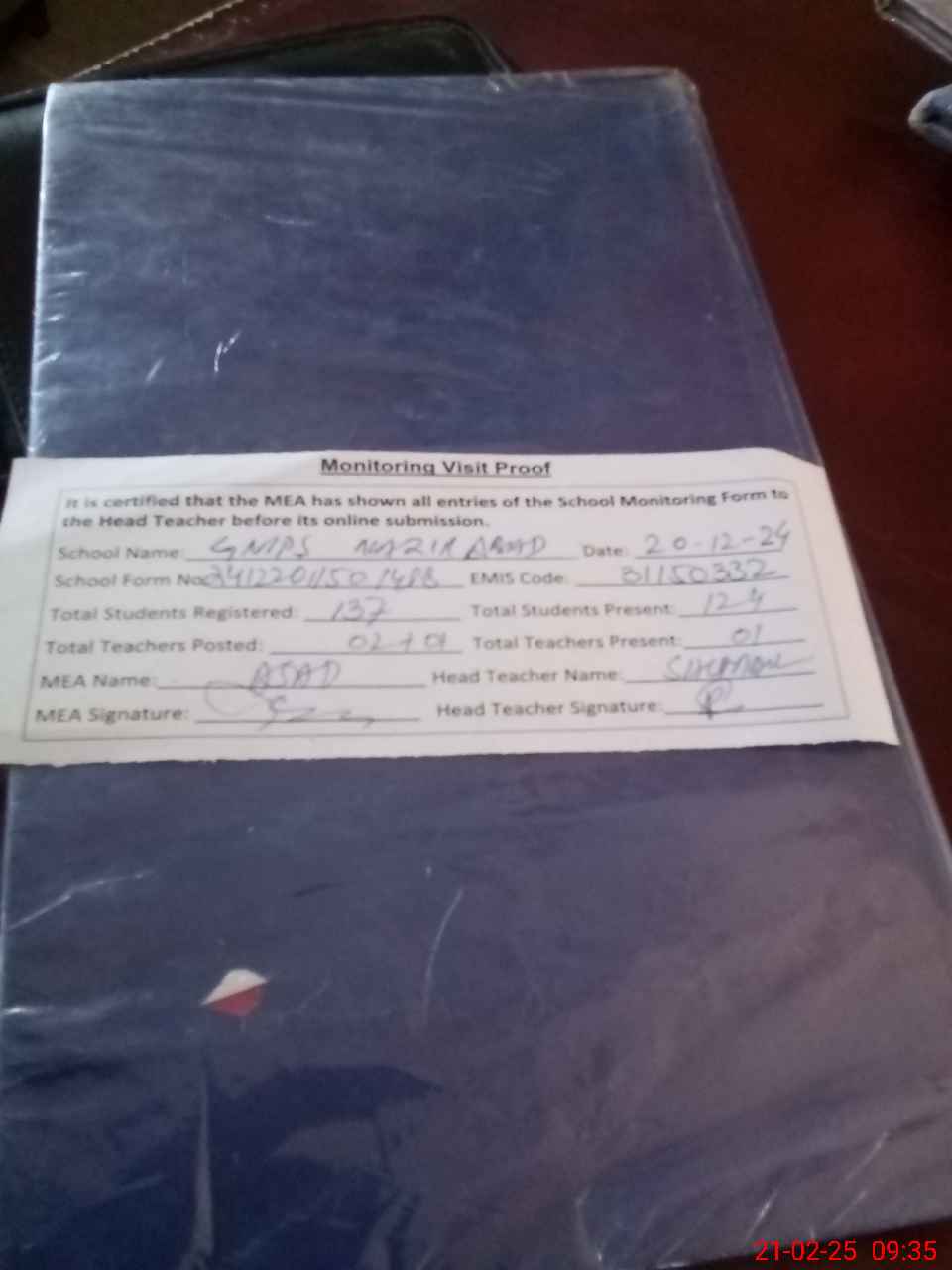 | Total no. of Classrooms: 6 No. of Classrooms Used for Teaching: 4 No. of Classrooms Storing Old Furniture, FTBs, etc: 0Comments if Any: Head teacher absent There is no record showing to the mea |